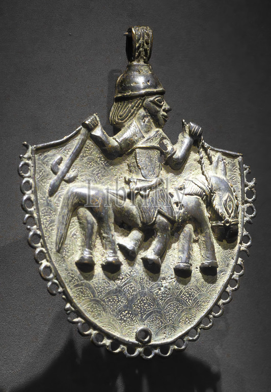 pendant, horse, rider, Benin Kingdom, Edo people, 17th-19th centuries, brass, 8-1/8 x 6-1/4 x 3/4, African Art