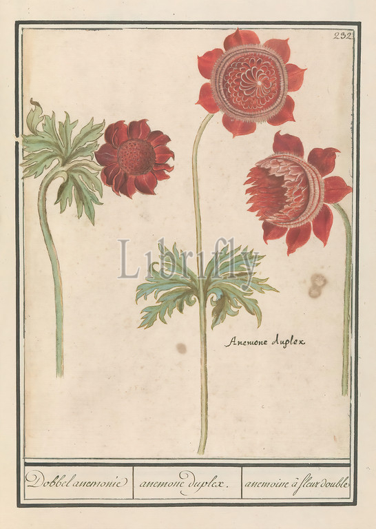 Peony, Paeonia, Anemone, Dice anemonie, anemone duplex, anemoine à fleur double, title, object, Red anemones, Numbered top right, 232, Right, Latin name, Part, third album, drawings, flowers, plants, Tenth, twelve albums, animals, birds, 1600, commissioned, Emperor Rudolf II, explanations, Dutch, Latin, French, Flowers, anemone, Anselmus Boetius de Boodt, 1596, 1610, paper, watercolor, paint, deck paint, chalk, ink, pen
