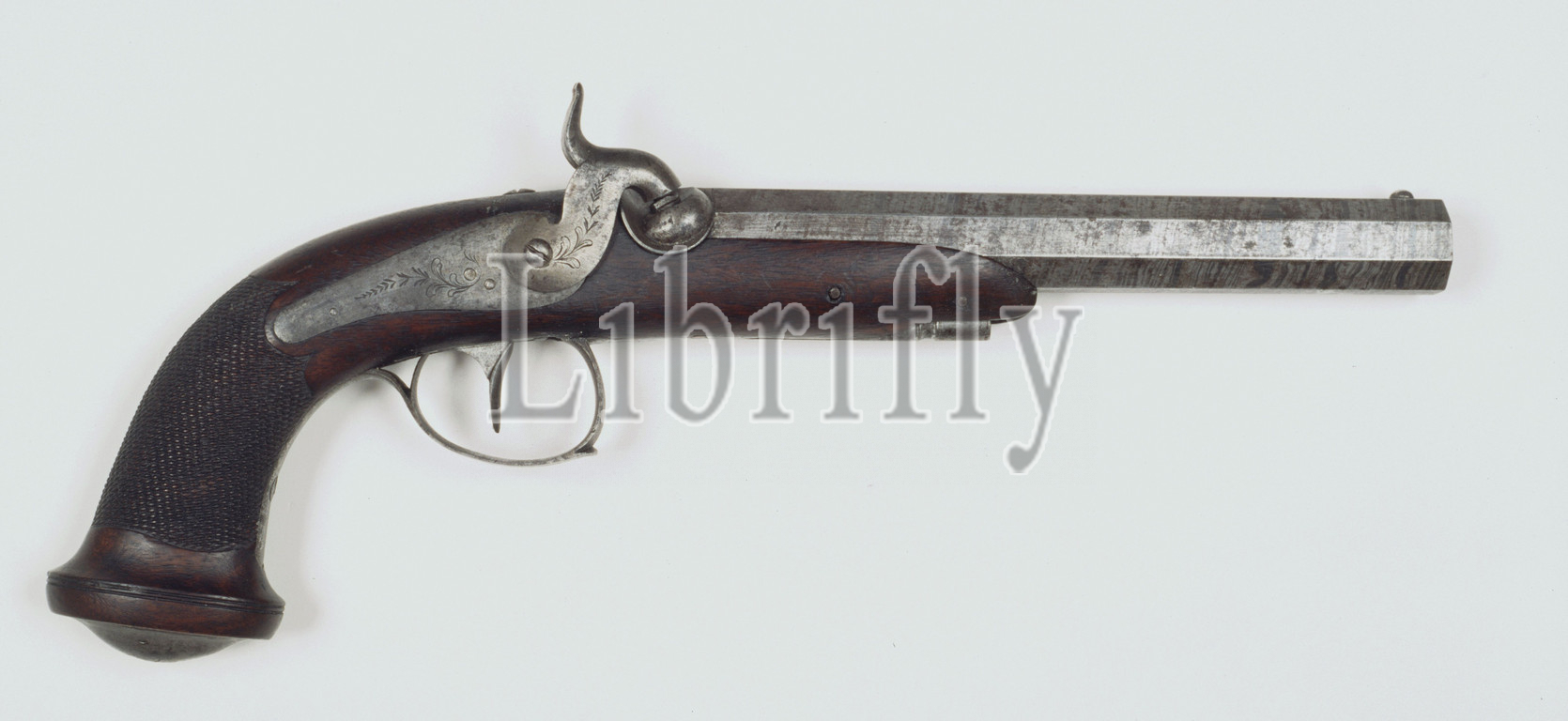 Percussion gun with octagonal barrel, Percussion gun with an octagonal drawn barrel. Walnut half drawer and butt which is grooved diamond-shaped. On the flask an iron flask which is engraved with a slender motif. The iron castle and the rooster are decorated with engraved tendrils. The trigger guard is made of iron and is decorated with floral patterns, the fittings under the drawer are also decorated with engraved floral patterns. The loading stick tube under the drawer is made of iron, the loading stick is missing. The ELG quality mark is engraved on the side of the barrel. an iron notch on the tail piece and an iron visor grain at the end of the barrel., anonymous, Europe, c. 1820 - c. 1840, wood (plant material), iron (metal), engraving, l 21 cm c 17 mm l 35 cm