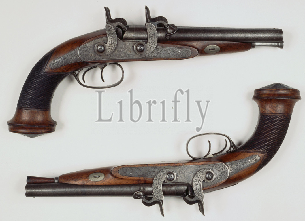 Percussion gun, two barrels, four roosters, Smooth looped loop, Two tractors, Iron loading stick, Engraving, Vizierkorrel, Netherlands, Frères Dewalle, Liège, city, c, 1844, 1862, lade, kolf, loop, slot, trekkerbeugel, trekker, engraving, l 20