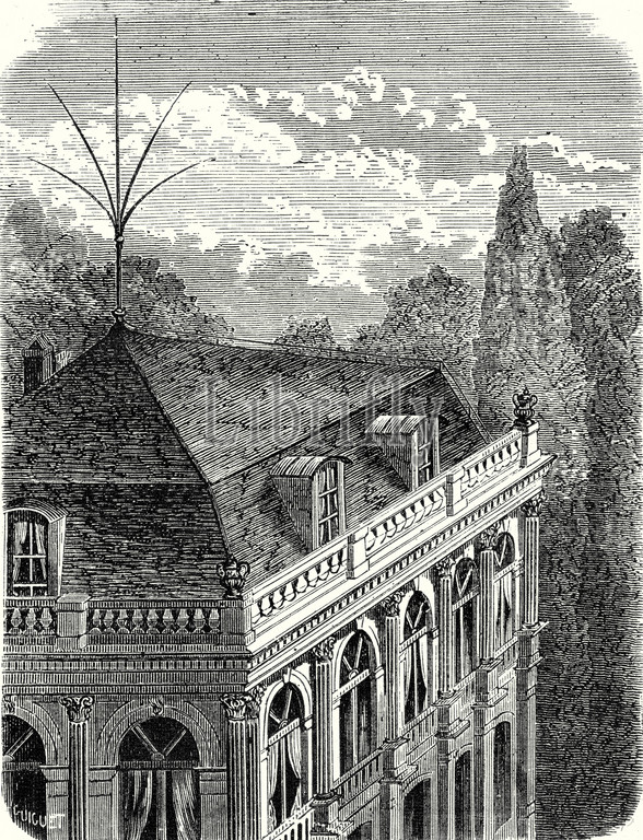 perrot, surge protector, adapted, lightning rod, roof, building, 19th century engraving, old print invention, vintage, old print, 19th century, victorian, retro, quint, lox, engraving