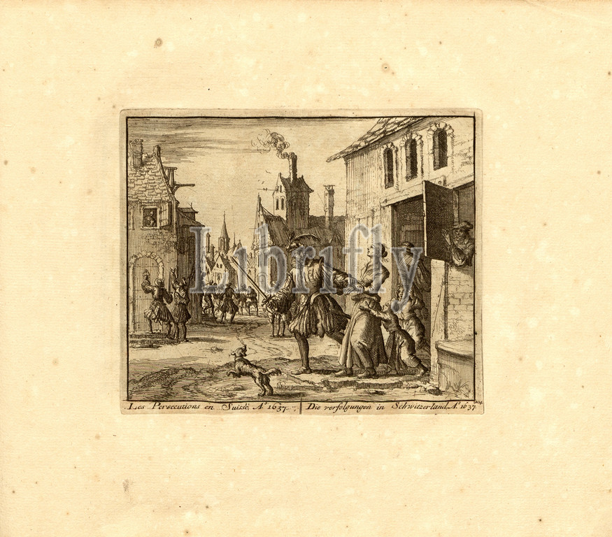 The Persecutions in Switzerland, Anno 1637, Parallel Title: The Chases in Schwitzerland, A nn o 1637, copperplate engraving, 104.), p. 217, Luyken, Jan (inv. et fec.), Jan Luyken: Théâtre des martyrs: depuis la mort de J.Christ jusqu'à present: représenté en très belles tailles-douces = Schau-Bühne der Martyrer; gezeichnet und in Kuppfer gestochen. Leyde: chez Pierre Van der Aa, [1711]