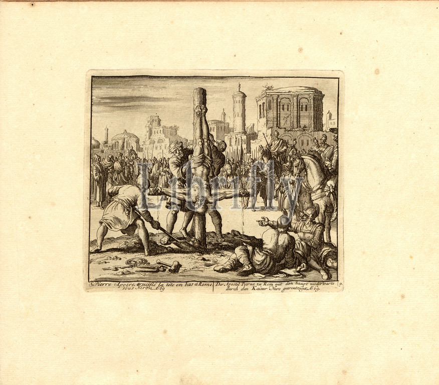S. Peter Apotra, crucified upside down in Rome, under Neron, Anno 69, Parallel title: The apostle Peter, at Rome, with the help of the Kaisar Nero, A nn o 69, copperplate engraving, 9.), p. 27, Luyken, Jan (inv. et fec.), Jan Luyken: Théâtre des martyrs: depuis la mort de J.Christ jusqu'à present: représenté en très belles tailles-douces = Schau-Bühne der Martyrer; gezeichnet und in Kuppfer gestochen. Leyde: chez Pierre Van der Aa, [1711]