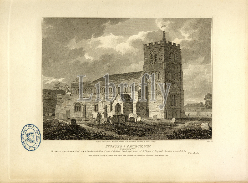 St. Peter's Church, N. W. Northampton, St. Peter's Church in Northampton and Cemetery, signed: Engraved by F. Hay from a Drawing by J. Britton, Fig. 7, Pl. II, after p. 8, Britton, John (Drawing); Hay, Frederick Rudolph (engr.), 1807, John Britton: The architectural antiquities of Great Britain: represented and illustrated in a series of views, elevations, plans, sections and details of various ancient English edifices: with historical and descriptive accounts of each. Bd. 2. London: J. Taylor, 1807-1826