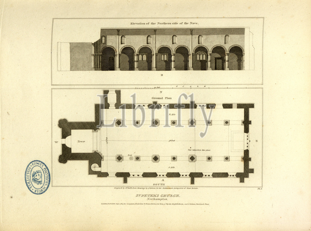St. Peter's Church, Northampton, Elevation and Floor Plan of St. Peter's Church in Northampton, signed: Engrav'd by R. Roffe, from Drawings by J. Britton, Fig. 6, Pl. I, p. 8, Britton, John (Drawing); Roffe, Richard (engr.), 1807, John Britton: The architectural antiquities of Great Britain: represented and illustrated in a series of views, elevations, plans, sections and details of various ancient English edifices: with historical and descriptive accounts of each. Bd. 2. London: J. Taylor, 1807-1826