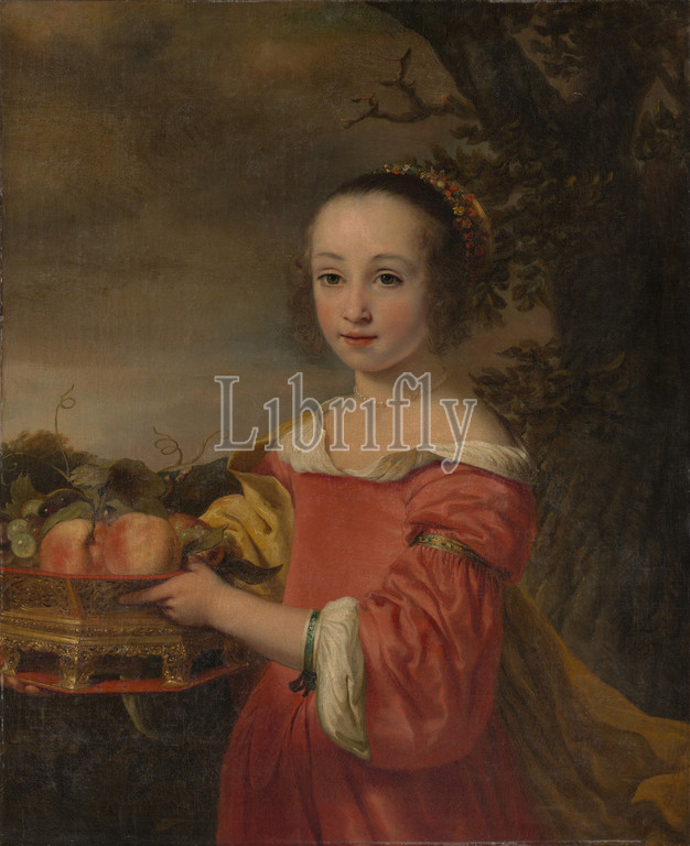 Petronella Elias (1648–1667) with a Basket of Fruit, 1657, Oil on canvas, 31 5/8 x 26 in. (80.3 x 66 cm), Paintings, Ferdinand Bol (Dutch, Dordrecht 1616–1680 Amsterdam), Bol was a pupil of Rembrandt in the late 1630s, and followed his teacher's style until the middle of the century. During the 1650s Bol became established in Amsterdam society, enjoyed considerable success as a portraitist and history painter, and adopted a more colorful, fluid, and Flemish style