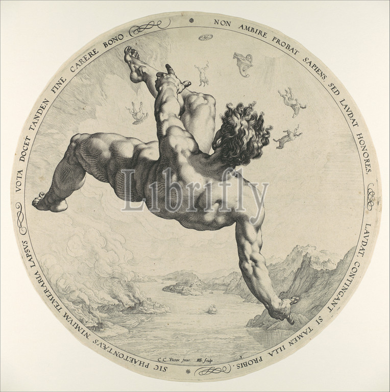 Phaeton, from The Four Disgracers, 1588, Engraving, Diameter: 13 3/16 in. (33.5 cm), Prints, Hendrick Goltzius (Netherlandish, Mühlbracht 1558–1617 Haarlem), After Cornelis Cornelisz van Haarlem (Netherlandish, Haarlem 1562–1638 Haarlem), This extraordinary tondo is one of the the most daring works to have resulted from the brief collaboration between Goltzius and the painter Cornelis Cornelisz van Haarlem. The common bond of the series of four fallers is that each one tried to enter the realm of the gods and was punished for his hubris