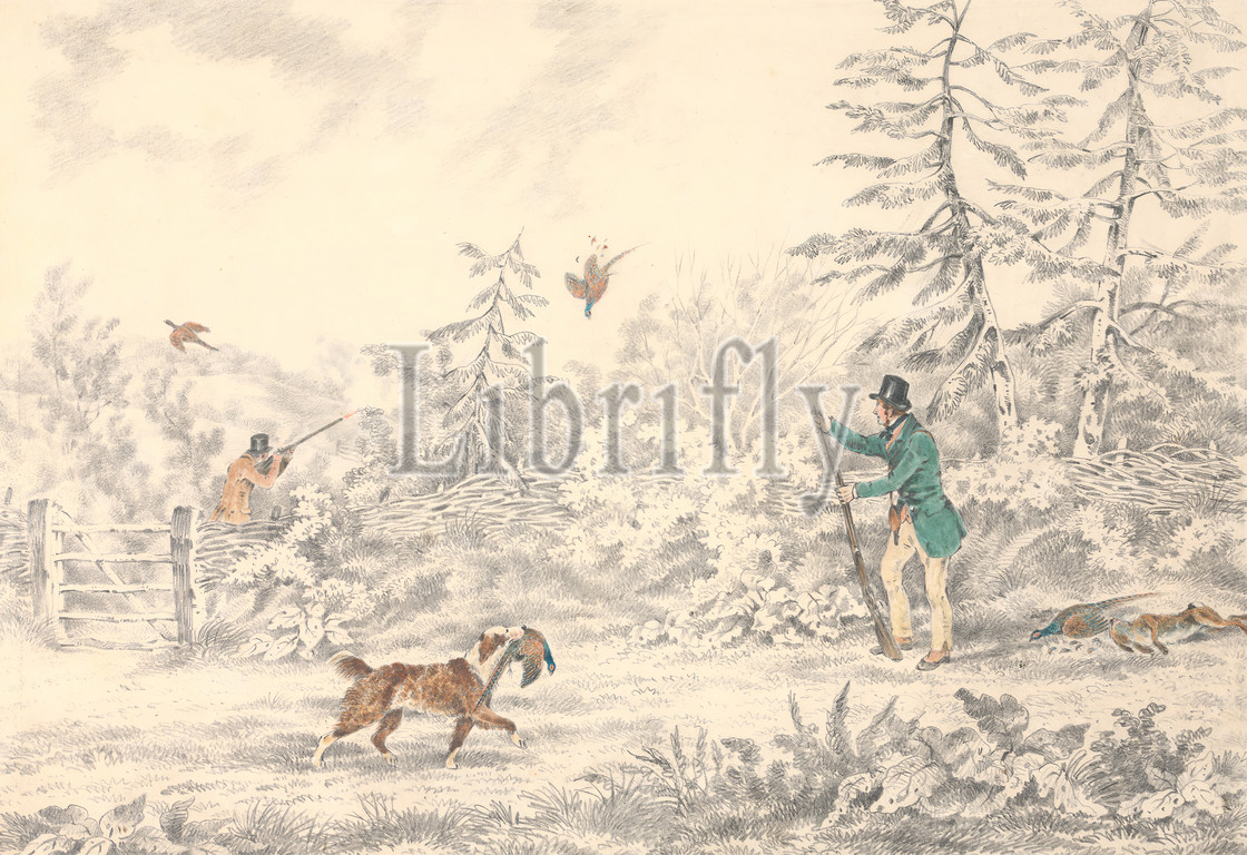 Pheasant Shooting, Henry Thomas Alken, 1785–1851, British, Samuel Henry Gordon Alken, 1810–1894, British, Graphite, watercolor, thick, slightly textured, cream, wove paper, Sheet, dog, animal, fence, forest, gate, hunters, hunting, landscape, men, pheasants, plants, shotguns, sporting art, trees