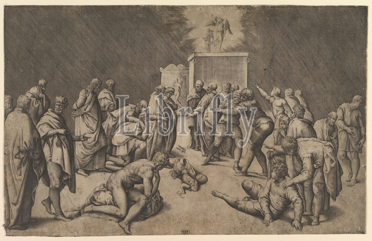 Philistines Place, Ark, Covenant, Temple, Dagon, ca, 1540, Engraving, etching, second state, plate, 10 7/16 x 16 5/16, 26.5 41.5 cm, Prints, Battista Franco, Italian, Venice ca., 1510–1561, Venice