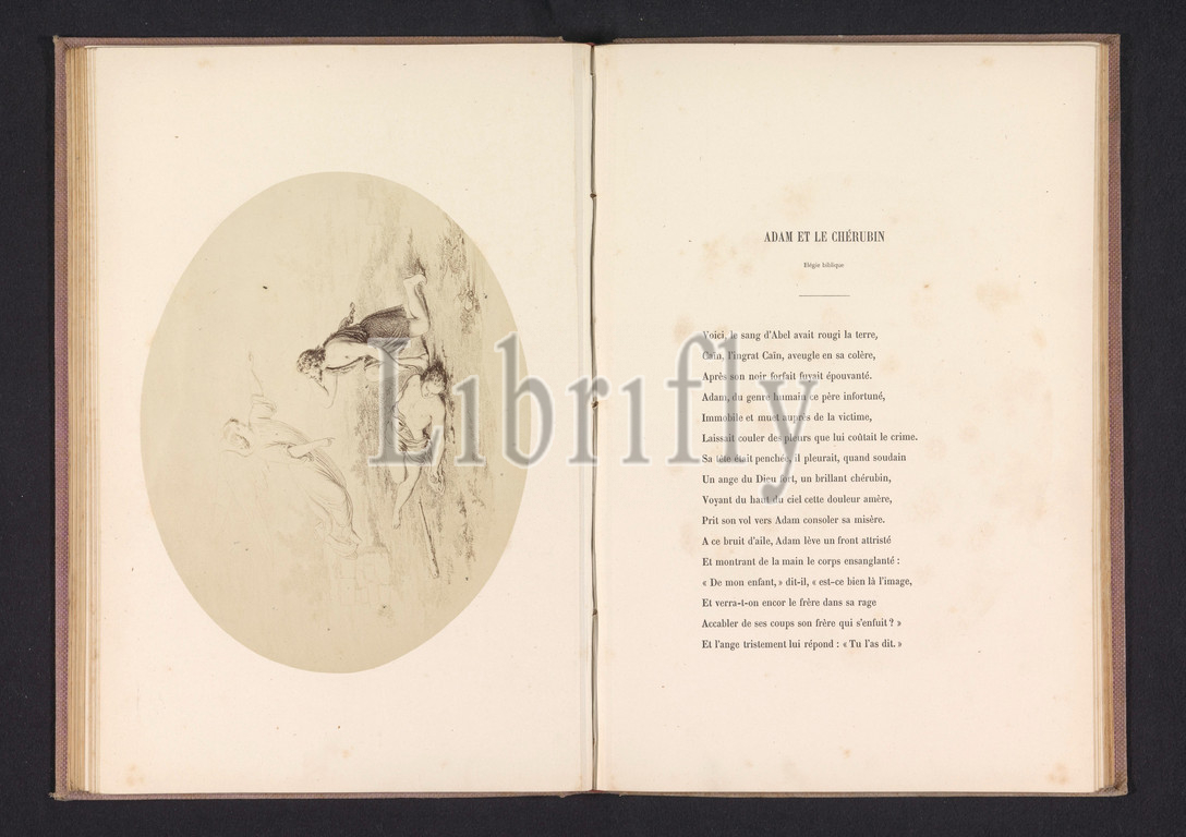 Photo reproduction, drawing depicting, angel, Adam, corpse, Abel, Abel's death, biblical context, angels, c, 1857, 1867, photographic paper, albumen print