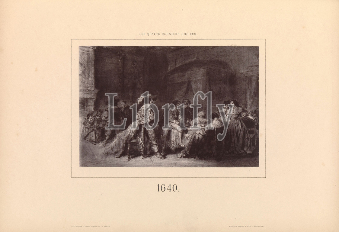 Photo reproduction of a drawing, depicting a company around a table in an interior 1640 (title on object), nobility and patriciate, chivalry, knighthood, table, interior representation of a building, anonymous, Amsterdam, c. 1868 - in or before 1873, paper, collotype, h 135 mm × w 200 mm