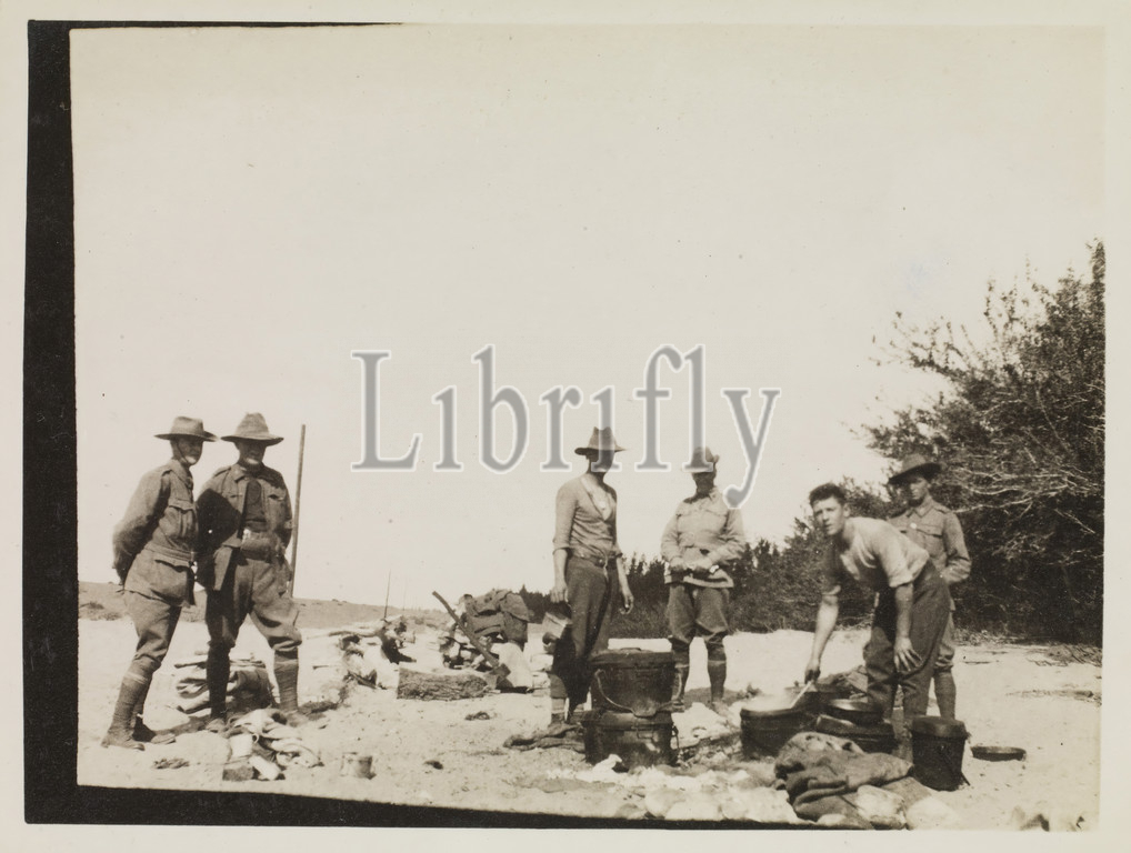 Photograph, Cooking, Egypt, Captain Edward Albert McKenna, World War I, 1914-1915, 108 images, album, photographs, 7th Battalion, Image, statue depicting, group, men cooking, Serapeum, Sarapeion, temple built, Ptolemaic Alexandria, honour, Greco-Egyptian god Serapis, hybrid, Egyptian gods Osiris, Apis