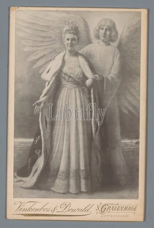 Photographic reproduction of a drawing of Queen Wilhelmina presented by an angel after Carel Dake, Vinkenbos & Dewald (mentioned on object), intermediary draughtsman: Carel Lodewijk Dake (mentioned on object), The Hague, 1898, cardboard, photographic support, height 166 mm × width 107 mm