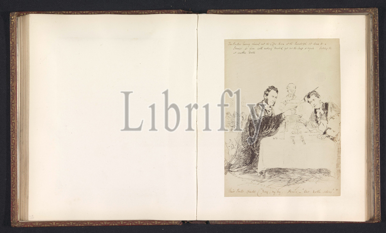 Photoreproduction of a drawing, depicting Reverends J. J. Hornsby and G. E. Thorley toasting at the Macdonald Randolph Hotel at Oxford, anonymous, intermediary draughtsman: anonymous, in or after 1864 - in or before 1866, photographic support, albumen print, height 194 mm × width 144 mm