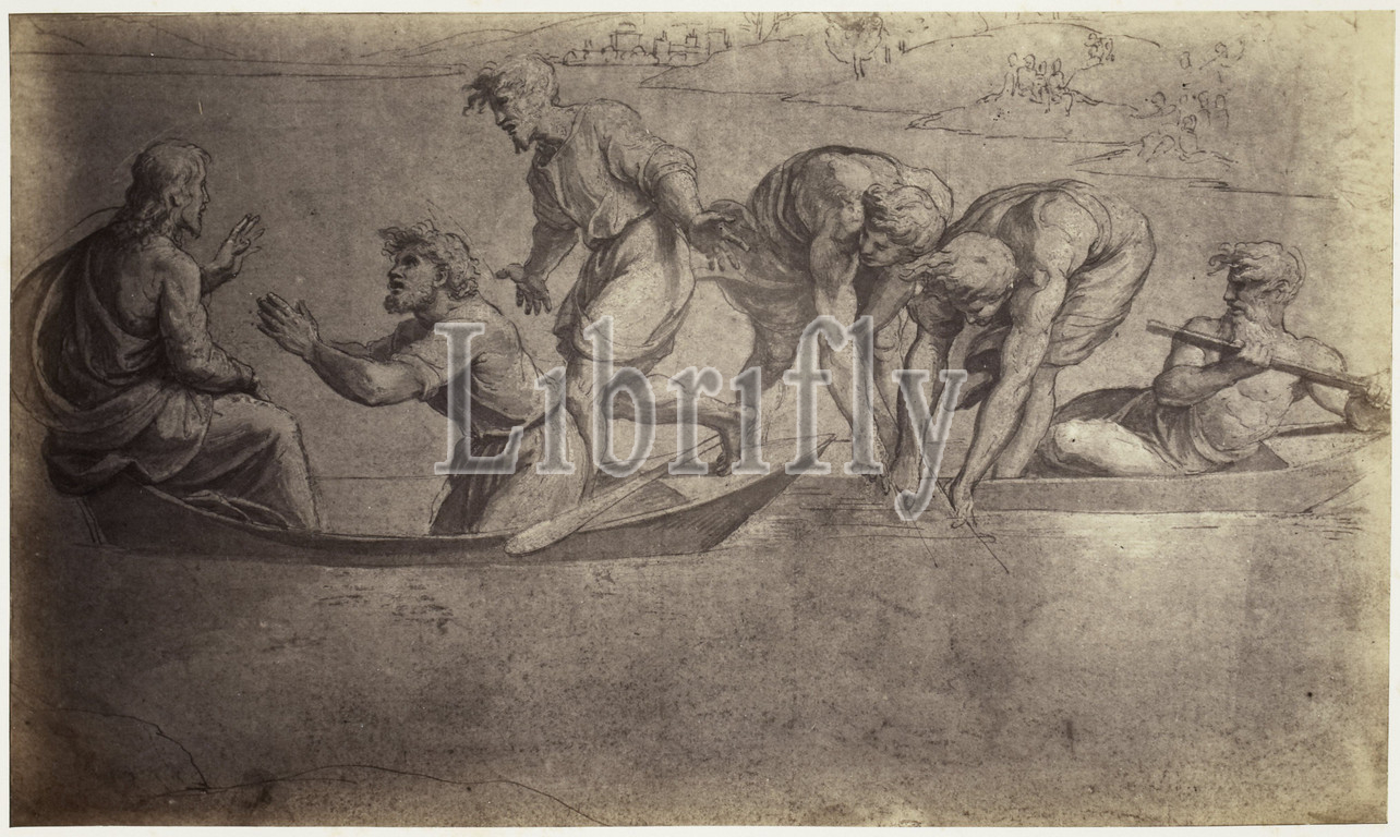 Photoreproduction of a drawing by Raphael, study for the Miraculous Fishing, Charles Thurston Thompson (mentioned on object), intermediary draughtsman: Rafaël (mentioned on object), Windsor Castle, c. 1852 - in or before 1857, paper, albumen print, height 198 mm × width 336 mm