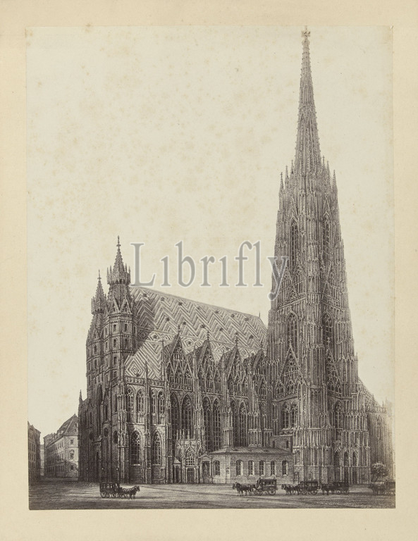 Photoreproduction, drawing, St, Stephen's Cathedral, Vienna, Austria, Die Stefanskirche, Cathedrale de St, Etienne, Cathedral, anonymous, intermediary draughtsman, anonymous, 1851, 1900, cardboard, paper, albumen print, height 430 mm, width 329 mm