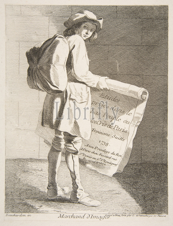 Picture Seller, 1738, Etching with some engraving, image: 9 x 7 1/16 in. (22.9 x 17.9 cm), Prints, Anne Claude Philippe de Tubières, comte de Caylus (French, Paris 1692–1765 Paris), After Edme Bouchardon (French, Chaumont 1698–1762 Paris), Etienne Fessard (French, Paris 1714–1777 Paris)