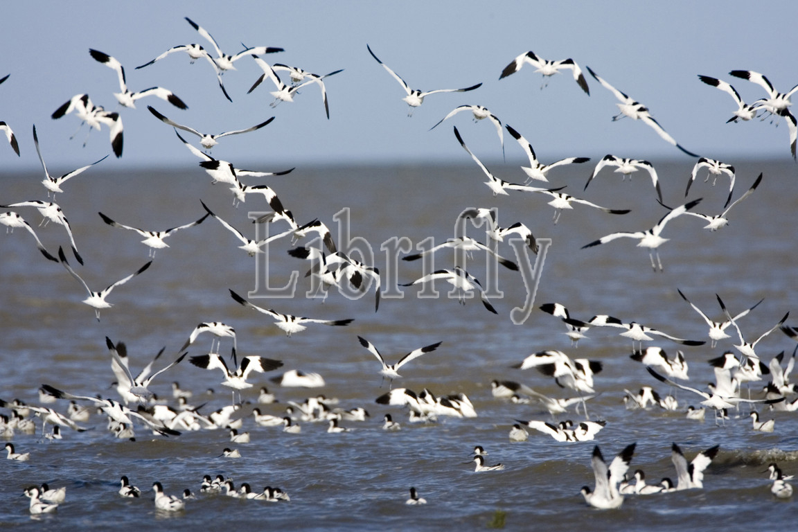 Pied Avocet flock flying, Recurvirostra avosetta