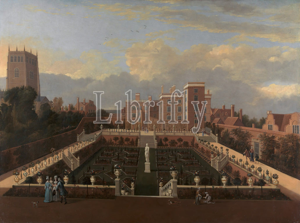 Pierrepont House, Nottingham, Nottinghamshire, eighteenth century, Formerly attributed, Leonard Knyff, 1650–1721, Dutch, active, Britain, 1681, ca, 1705, Oil, canvas, Support, PTG, architectural subject, buildings, children, church, costume, country house, dogs, animals, espalier trees, exoticism, flowers, plants, formal garden, gardens, genre subject, Gothic, Medieval, grass, house, landscape, mansion, men, mythology, parterre, people, running, sculpture, stairs, statue, steps, vases, walking, women, England, Nottingham, Nottinghamshire, United Kingdom