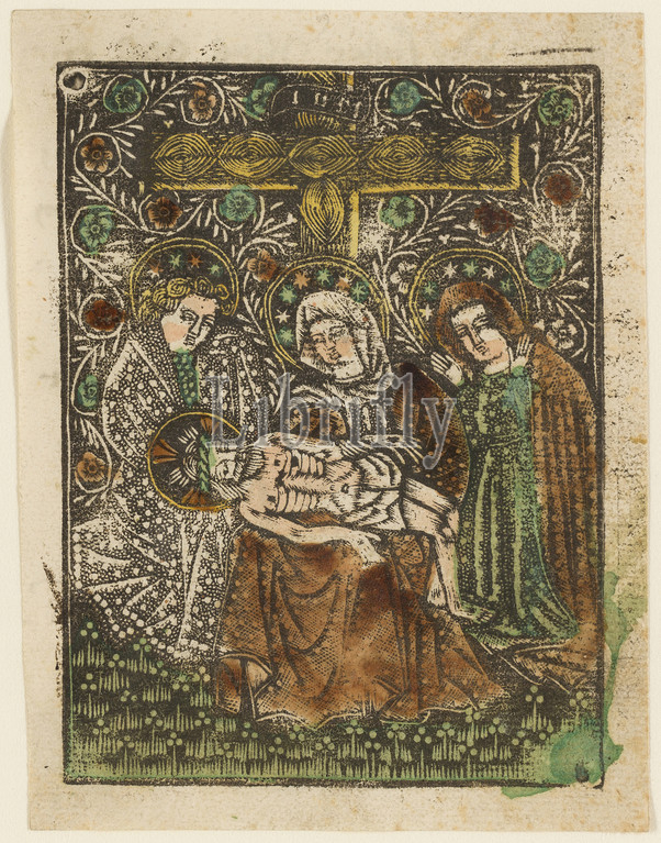 The Pietà, 1460–65, Bavarian, 15th century, Germany, Metalcut in black hand colored with brush and watercolor in yellow, red-brown lake, and green, on ivory laid paper, with manuscript text in pen and brown ink on verso, 100 × 75 mm (plate), 105 × 80 mm (sheet)