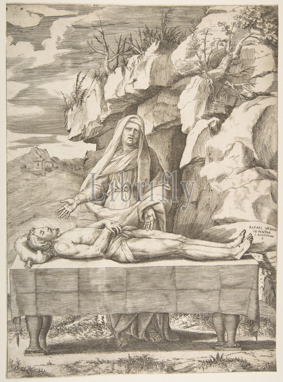 Pieta, Christ stretched out on a table in a landscape, the Virgin standing behind arms open, 1531–76, Engraving, sheet: 13 5/16 x 9 5/8 in. (33.8 x 24.5 cm), Prints, Giulio Bonasone (Italian, active Rome and Bologna, 1531–after 1576), After Raphael (Raffaello Sanzio or Santi) (Italian, Urbino 1483–1520 Rome)
