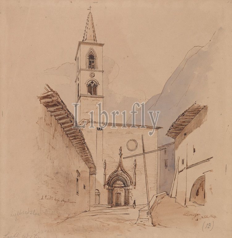 S, Pietro Degli Agostiniani, Leonessa., Edward Lear, 1812–1888, British, 1844, Watercolor, graphite, brown wash, pen, brown ink, moderately thick, slightly textured, beige wove paper, Sheet, architectural subject, bell tower, church, doorway, figure, representation, mountains, stone, wall, windows, Italy, Lazio, Leonessa, Rieti, Terminillo, Monte