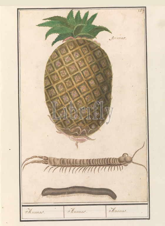 Pineapple, Ananas comosus, title, object, centipede, million leg, Numbered top right, 159, fruit, name, Part, second album, drawings, flowers, plants, Ninth, twelve albums, animals, birds, 1600, commissioned, Emperor Rudolf II, explanations, Dutch, Latin, French, fruits, pineapple, Anselmus Boetius de Boodt, 1596, 1610, paper, watercolor, paint, deck paint, ink, pen