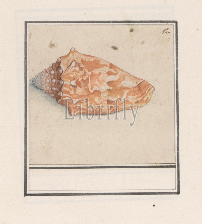 Pink wing horn, Strombus gigas, Numbered top right, 12, Part, sixth album, drawings, fish, shells, insects, Sixth, twelve albums, animals, birds, plants, 1600, commissioned, Emperor Rudolf II, explanation, Dutch, Latin, French, Anselmus Boetius de Boodt, 1596, 1610, paper, pencil, chalk, watercolor, paint, deck paint, brush