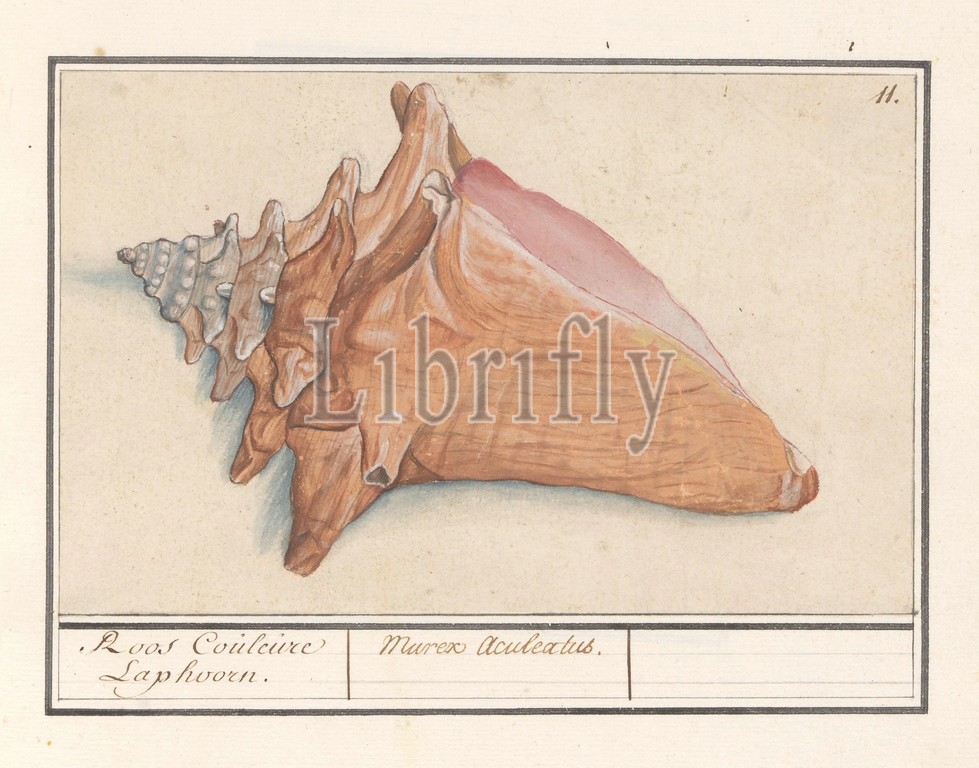 Pink winged horn, Strombus gigas, Roos Couleure Laphoorn, Murex Aculeatus, title, object, Numbered top right, 11, Part, sixth album, drawings, fish, shells, insects, Sixth, twelve albums, animals, birds, plants, 1600, commissioned, Emperor Rudolf II, explanation, Dutch, Latin, French, Anselmus Boetius de Boodt, 1596, 1610, paper, pencil, chalk, watercolor, paint, deck paint, brush