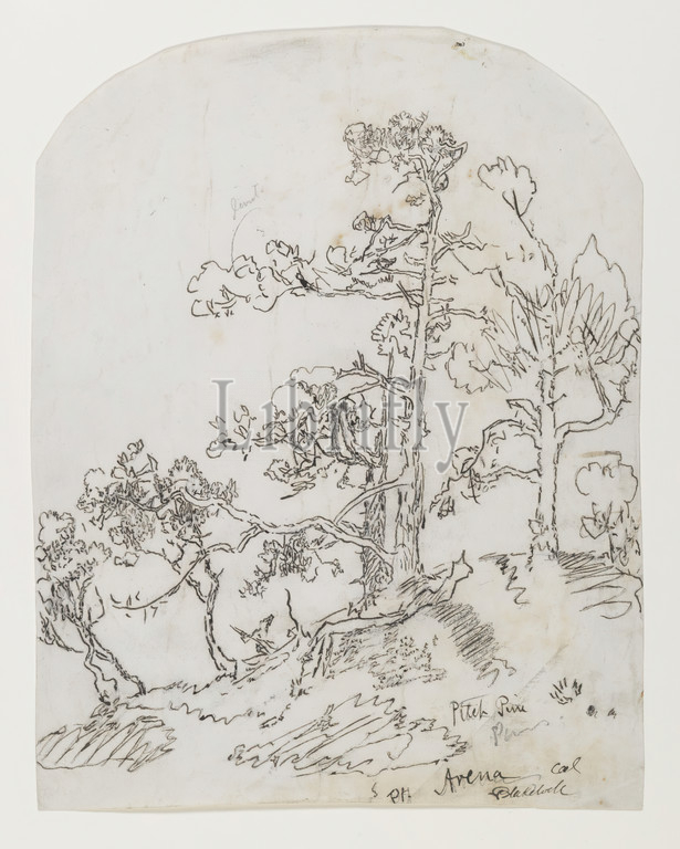 Pitch Pine, Point Arena, California, Ralph Albert Blakelock, American, 1847-1919, Ink, graphite, moderately thick, moderately textured, cream colored wove paper, ca. 1869-1871, Sheet, rounded, top, 10 15/16 x 8 1/2, 27.8 x 21.6 cm, American, drawing, fine lines, ink, line drawing, tree, trees