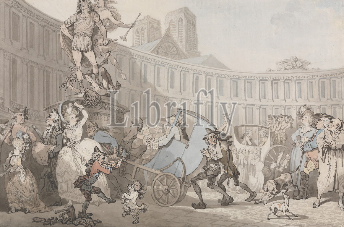 Place des Victoires, Paris, Thomas Rowlandson, 1756–1827, British, ca, 1783, Watercolor, pen, black ink, graphite, medium, moderately textured, cream antique laid paper, Sheet, Image, architectural subject, building, carriages, carts, cathedral, celebration, chaos, cityscape, costume, dogs, animals, figures, French, genre subject, Grand Tour, humor, monk, music, musician, plaza, satire, satirical, sculpture, snakes, statue, street, victory, violin, violinist, walking, Europe, France, Notre-Dame, Paris, Place des Victoires