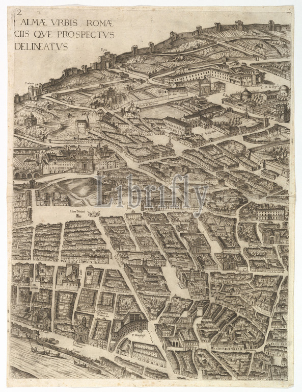 Plan, City, Rome, Part 2, Trinita dei Monti, Palazzo Borghese, Baths, Diocletian, 1645, Etching, engraving, undescribed state, Sheet, 21 3/16 x 15 13/16, 53.8 40.2 cm, Prints, Antonio Tempesta, Italian, Florence, 1555–1630, Part, top half, map, Depicted, north-eastern part, city within, walls