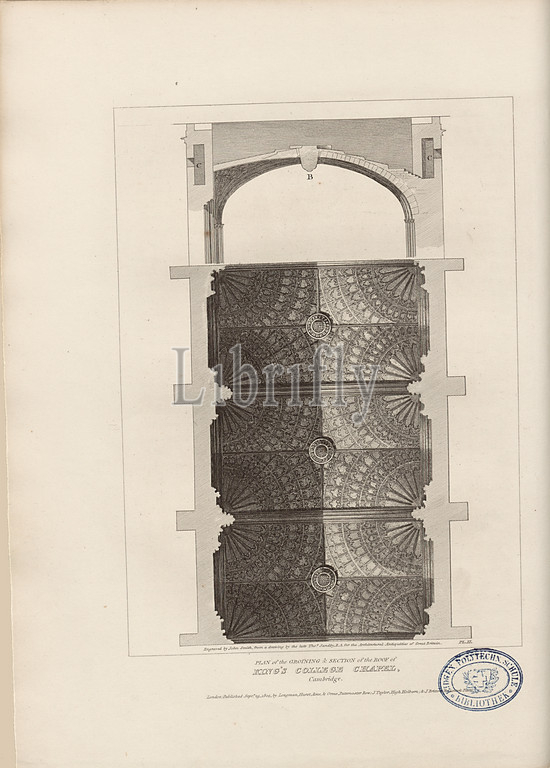 Plan, Groining, Section, Roof, King's College Chapel, Cambridge, Plan, ceiling, Chapel, King's College, Cambridge, signed, Engraved, John Smith, drawing, late Tho., Sandby, Fig. 12, Pl. 2, p. 8, Thomas, Drawing, Smith, John, Engraving, 1805, John Britton, architectural antiquities, Great Britain, represented, illustrated, series, views, elevations, plans, sections, details, various ancient English edifices, historical, descriptive accounts, Bd, 1, London, J, Taylor, 1807-1826