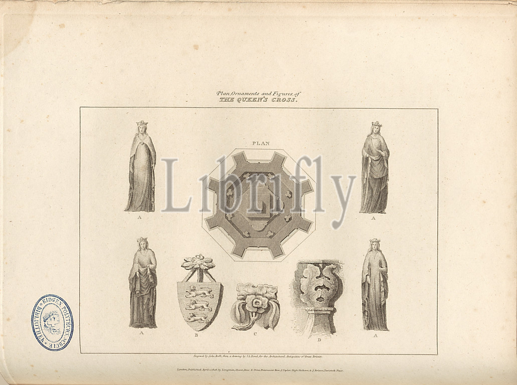 Plan, Ornaments, Figures, Queen's Cross, Floor plan, details, Eleanor Cross, Hardingstone, Northampton, signed, Engraved, John Roffe, drawing, I. L. Bond, Fig. 44, p. 24, Bond, John Linnell, Drawing, Roffe, John, engr., 1806, John Britton, architectural antiquities, Great Britain, represented, illustrated, series, views, elevations, plans, sections, details, various ancient English edifices, historical, descriptive accounts, Bd, 1, London, J, Taylor, 1807-1826