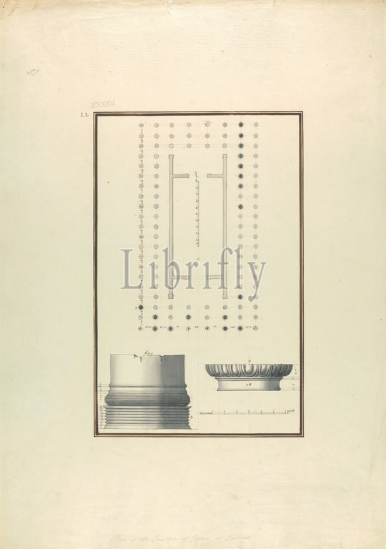Plan, Temple, Juno, Samos, Details, Column, Giovanni Battista Borra, 1713–1770, Italian, ca, 1750, Watercolor, black, brown ink, graphite, moderately thick, moderately textured, beige laid paper, Sheet, Image, architectural subject, columns, floor plan, scale, rule, temple, Greece, Nísoi Aiyaíou, Sámos, Sámos, Sámos, Nísos