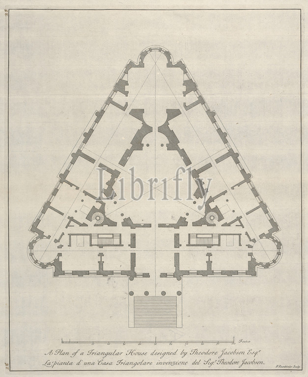 A Plan of a Triangular House Designed by Theodore Jacobsen Esqr., Paul Fourdrinier, French, after Theodore Jacobsen, died 1772, British, undated, Etching on moderately thick, slightly textured, cream laid paper, Sheet: 19 3/4 x 16 1/4 inches (50.2 x 41.2 cm), Plate: 14 5/16 x 11 5/8 inches (36.3 x 29.6 cm), and Image: 14 x 11 3/8 inches (35.5 x 28.9 cm), architectural drawing, architectural subject, design, house, measurement, plan (drawing), scale (rule), triangular