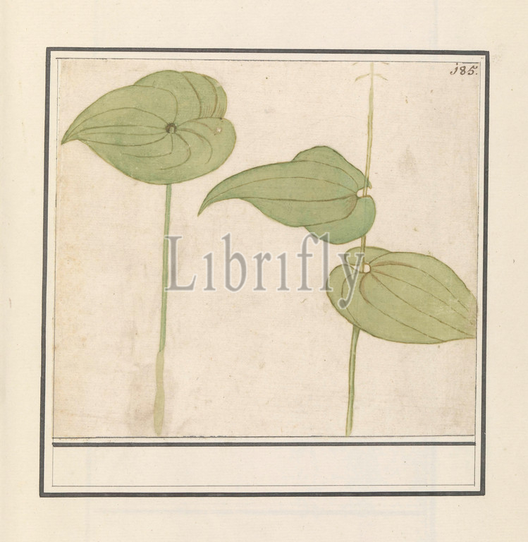 Plant, unknown species, leaves, unknown plant, water lily, Numbered top right, 185, Part, second album, drawings, flowers, plants, Ninth, twelve albums, animals, birds, 1600, commissioned, Emperor Rudolf II, explanation, Dutch, Latin, French, Plants, herbs, water-lily, Anselmus Boetius de Boodt, 1596, 1610, paper, watercolor, paint, deck paint, chalk, pen
