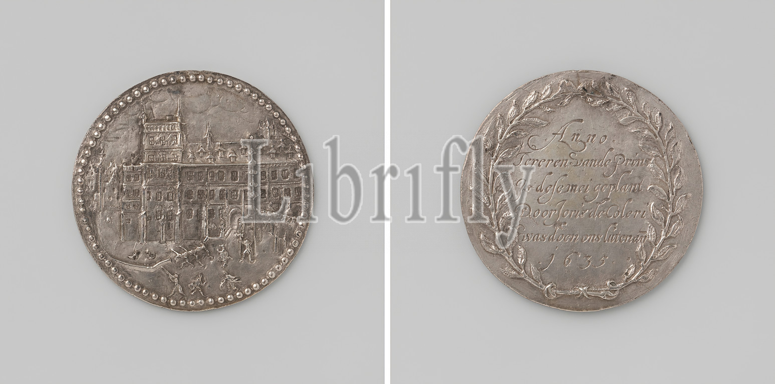 Plants, tree, Hague, black-and-white Medal, Front, view, Buitenhof, inscription within laurel wreath, 1635, black-and-white, metal, engraving