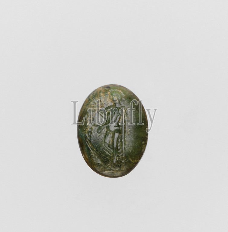 Plasma ring stone, Late Republican, Imperial, ca, 1st century B.C.–3rd .D, Roman, Plasma, 3/8 x 1/8 1/2, 0.9 0.4 1.3 cm, Gems, Bonus Eventus, youth, holding dish, fruit, branch, Roman genius, Good Fortune, popular figure, art, gems