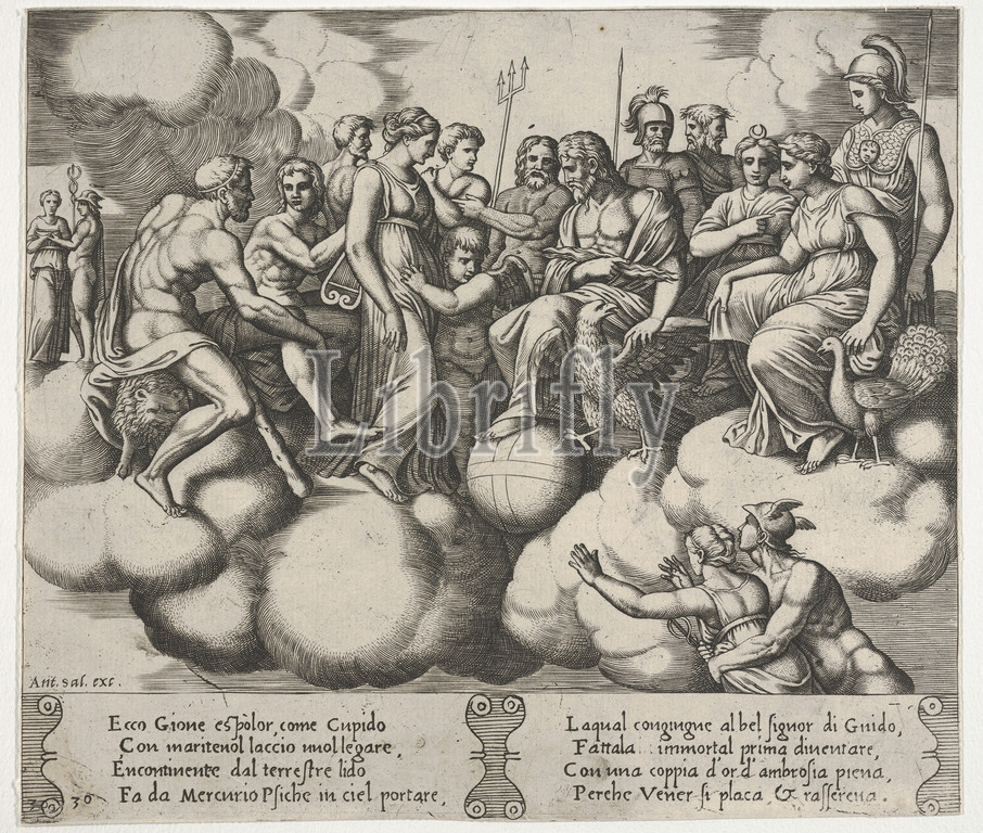 Plate 30, Cupid, Psyche plead, cases, Gods, Fable, Cupd, Psyche, 1530–60, Engraving, plate, 7 11/16 x 8 7/8, 19.6 22.6 cm, Prints, Master of the Die, Italian, active Rome, ca., After Raphael, Raffaello Sanzio or Santi, Urbino, 1483–1520, Rome