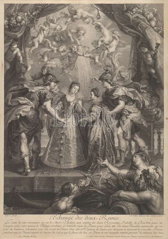 Plate 17, exchange, two princesses, Hendaye, allegorical scene, Anne, Austria, Elizabeth, Bourbon standing, bridge holding hands, Recueil de la Galerie du Luxembourg, 1707–10, Engraving, Sheet, 19 15/16 x 14 1/8, 50.7 35.8 cm, Prints, Benoit Audran the Elder, French, Lyon, 1661–1721, Paris, Intermediary draughtsman Jean Marc Nattier, 1685–1766, After Peter Paul Rubens, Flemish, Siegen, 1577–1640, Antwerp