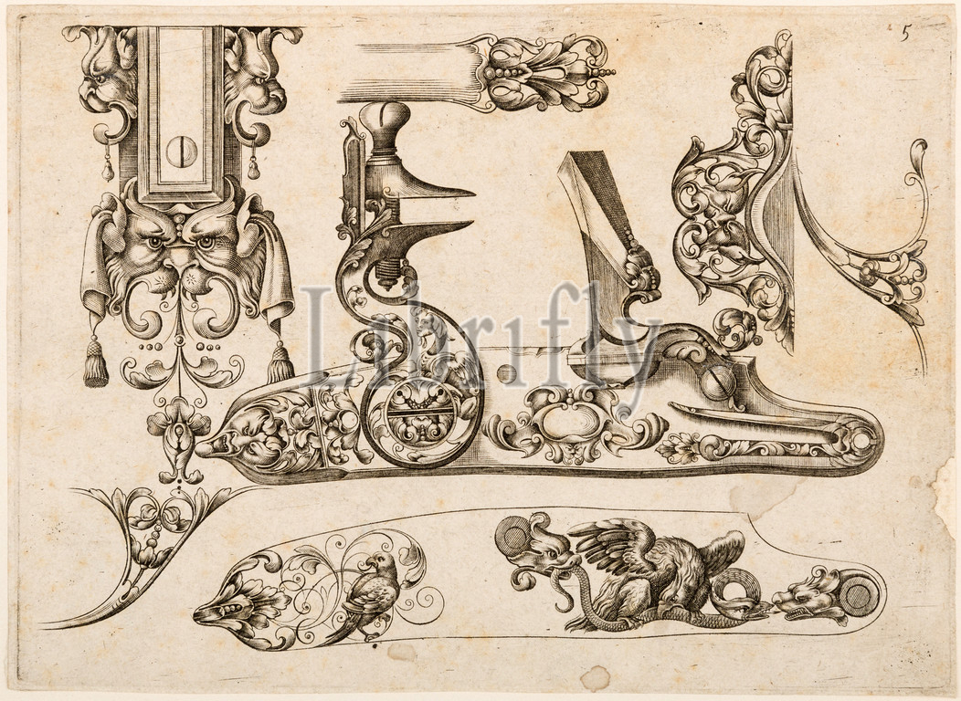 Plate Five, Plusieurs Models des plus nouuelles manieres qui sont en usage l, ca, 1660, Paris, French, Engraving, sheet, 7 1/4 x 5 1/4, 18.4 13.3 cm, Works, Paper-Engravings, Little, royal gunmakers, Thuraine, Le Hollandois, published, pattern book, sheet comes, remains, rare, important document, Parisian gunmaking, leading style, firearms ornament early, reign, Louis XIV
