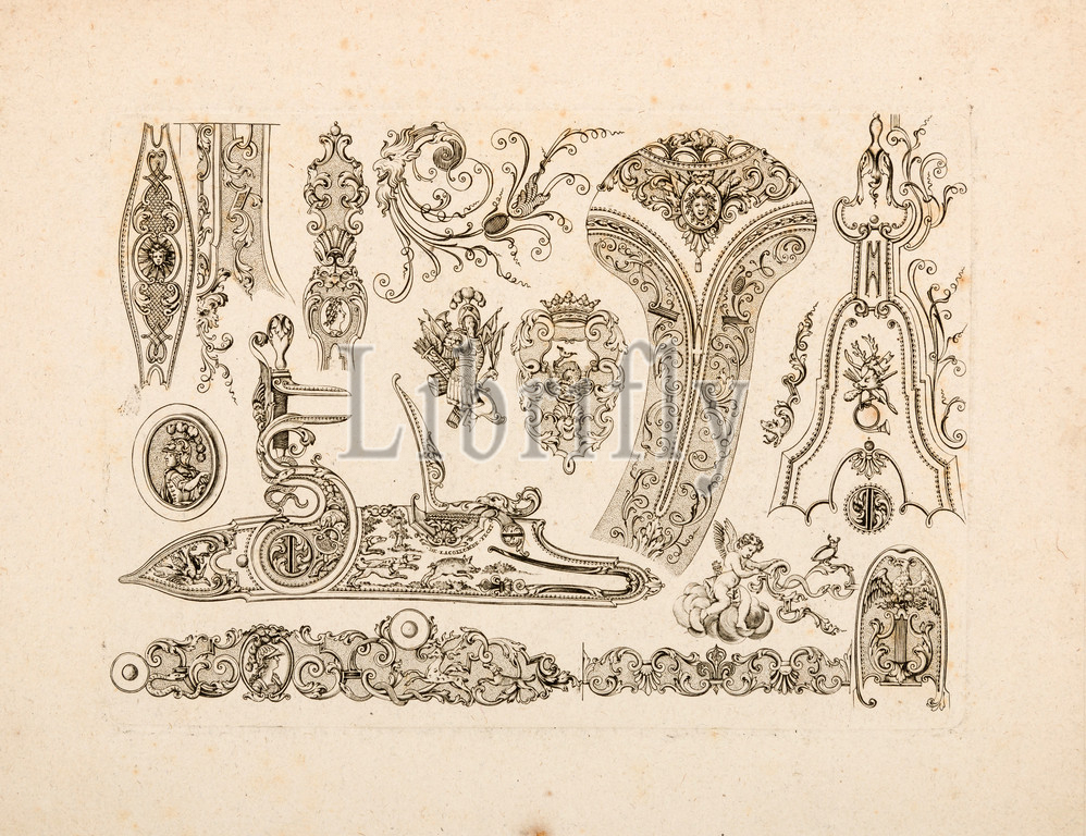 Plate Four, Nouveavx Desseins D'Arquebvseries, ca, 1730, Paris, French, Engraving, sheet, 11 3/4 x 9 1/8, 29.8 23.2 cm, plate, 9 1/4 6 5/8, 23.5 16.8, Works, Paper-Engravings, print, prime example, French designs, decoration, firearms, late rococo, style, set, fashion, luxury arms, across, Europe, time, created, enigmatic engraver, De Lacollombe, comes, series, prints, added, death, published, better, pupil Gilles, Demarteau, 1722–1776, 1749