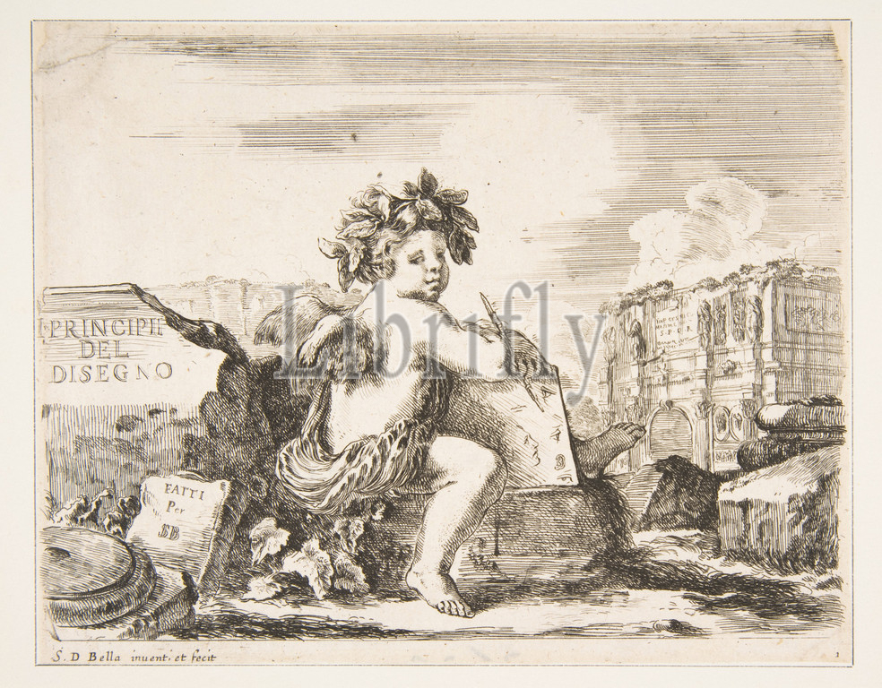 Plate 1, genius, drawing, child, wings, seated, rock, center turned towards, right, holding, drawing pad, pen, ruins, triumphal arch, background, title page, Principles, Design, I principii del disegno, ca, 1641–43, Etching, second state, two, Sheet, trimmed, 5, 6 3/8, 12.7, 16.2 cm, Prints, Stefano della Bella, Italian, Florence, 1610–1664