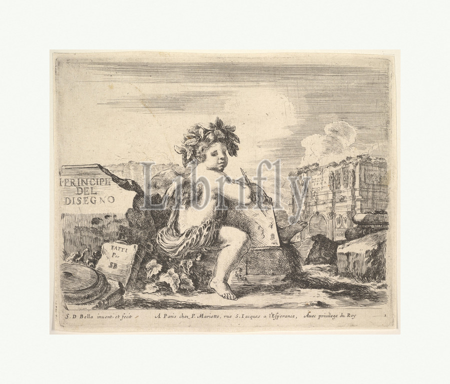 Plate 1, genius, drawing, child, wings, seated, rock, center turned towards, right, holding, drawing pad, pen, ruins, triumphal arch, background, title page, Principles, Design, I principii del disegno, ca, 1641, Etching, Sheet, 5 1/4 x 6 7/16, 13.3 16.3 cm, Prints, Stefano della Bella, Italian, Florence, 1610–1664
