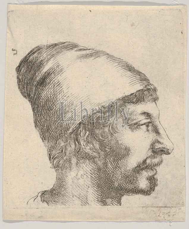 Plate 38: head of a man with a moustache and cap, facing right in profile, from 'Various portraits' (Recueil de diverses pièces servant à l'art de portraiture), ca. 1647, Etching, Sheet: 2 15/16 x 2 1/2 in. (7.5 x 6.4 cm), Prints, Stefano della Bella (Italian, Florence 1610–1664 Florence)