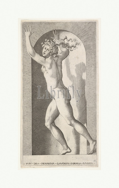 Plate 16: Hebe in a niche with her hands in the air, running to the left while looking to the right, from a series of mythological gods and goddesses, 1526, Engraving, Sheet: 8 9/16 × 4 1/2 in. (21.7 × 11.5 cm), Prints, Giovanni Jacopo Caraglio (Italian, Parma or Verona ca. 1500/1505–1565 Krakow (?)), After Rosso Fiorentino (Italian, Florence 1494–1540 Fontainebleau)