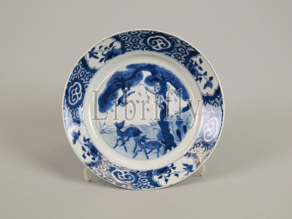 清 青花, 爵祿封侯, 瓷盤, Plate, Monkey, Bees, Magpie, Deer, Qing dynasty, 1644–1911, late 17th–early 18th century, China, Porcelain painted, blue underglaze, H, 1 1/8, 2.9 cm, Diam, rim 5 7/8, 14.9, foot 3 3/8, 8.6, Ceramics, Visual puns, using homophones, popular design, language, Chinese art, addition, zodiac animal, monkey, symbolizes, noble title, pronounced, word, marquis, hou, Chinese
