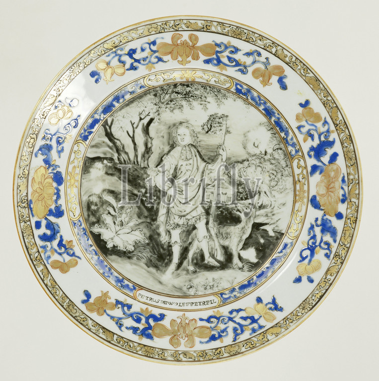 Plate, portrait, Petrus de Wolff, Porcelain plate, painted, glaze, blue, red, black, gold, shelf, depiction, young man, rifle resting, ground, left hand, left, dog, looks up, located, wooded area, house, background, wall flower vines, blue enamel alternated, flower vines, cartouches, cartouche, bottom, you, see, inscription 'PETRUS DE WOLFF PETR FIL, border, four flower vines, band, performance, print, Pieter Schenk, 1660-1711, Schenk, engraving, mezzo-tone, John Smith, again inspired, painting, Willem, William Wissing, 1656-1687, crack, edge, European representation, enamel colors, encre de Chine, anonymous, England, c, 1725, 1749, Qing-dynasty, 1644-1912, Yongzheng-period, 1723-1735, Qianlong-period, 1736-1795, porcelain, material, metal, vitrification