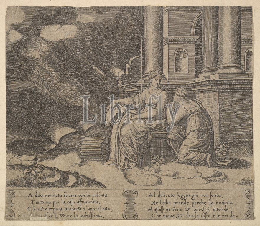 Plate 27: Proserpina gives Psyche the box of beauty, from 'The Fable of Cupid and Psyche', 1530–60, Engraving, Sheet: 7 11/16 × 8 15/16 in. (19.6 × 22.7 cm), Prints, Master of the Die (Italian, active Rome, ca. 1530–60), After Michiel Coxie (I) (Netherlandish, Mechelen ca. 1499–1592 Mechelen)